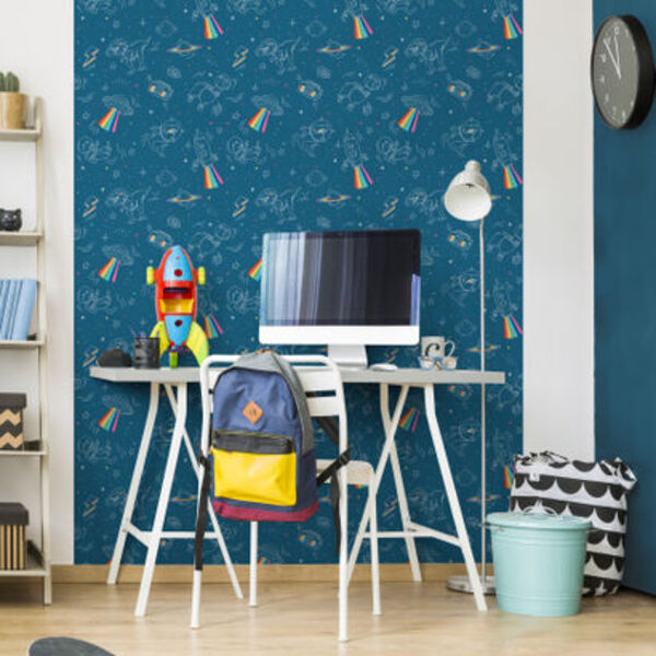Invitez l’imaginaire à voyager dans l’espace avec ce papier peint au design fun et poétique. Sur un fond bleu profond évoquant le ciel nocturne, des illustrations délicates prennent vie : dinosaures astronautes, fusées, planètes, étoiles et soucoupes volantes se mêlent dans un univers cosmique plein de fantaisie. Les touches arc-en-ciel apportent une note joyeuse et colorée à l’ensemble.