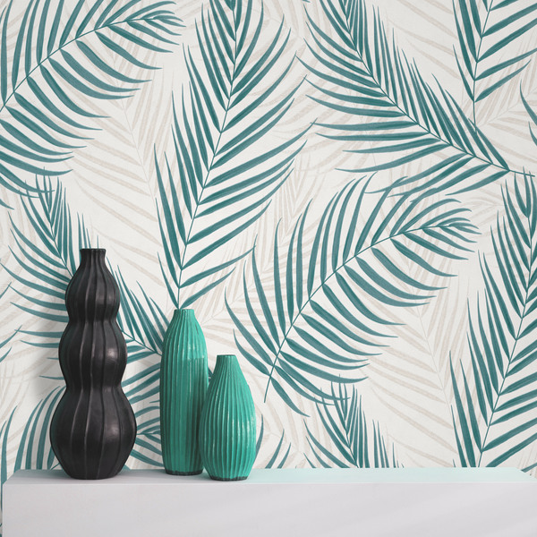 Apportez une touche de fraîcheur naturelle à votre décoration avec ce papier peint aux motifs de feuilles de palmier. Le design joue sur un contraste délicat entre des palmes au vert canard soutenu et des silhouettes plus discrètes dans des tons sable et beige, créant ainsi un effet de superposition et de profondeur organique.