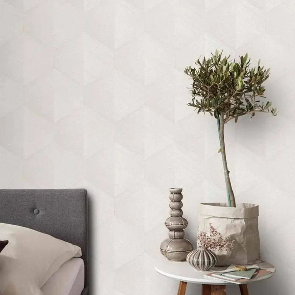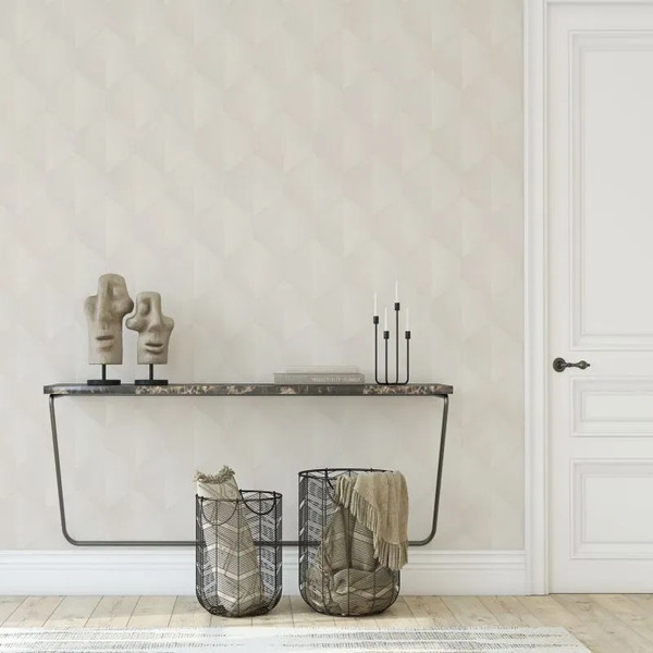 Ce papier peint présente un motif géométrique subtil et raffiné, jouant sur les volumes et les nuances pour créer un effet à la fois moderne et élégant. Le dessin met en avant des formes hexagonales ou cubiques imbriquées, formant une illusion de relief, comme si les surfaces se superposaient ou s’entrecroisaient. Les teintes sont très douces, dans une palette de gris clair légèrement nuancé, presque sable ou perle, ce qui apporte une atmosphère apaisante et lumineuse.
