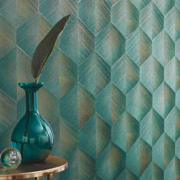 Ce papier peint présente un motif géométrique subtil et raffiné, jouant sur les volumes et les nuances pour créer un effet à la fois moderne et élégant. Le dessin met en avant des formes hexagonales ou cubiques imbriquées, formant une illusion de relief, comme si les surfaces se superposaient ou s’entrecroisaient. Les teintes sont foncées, dans une palette de vert légèrement nuancé, ce qui apporte une atmosphère chic et moderne.