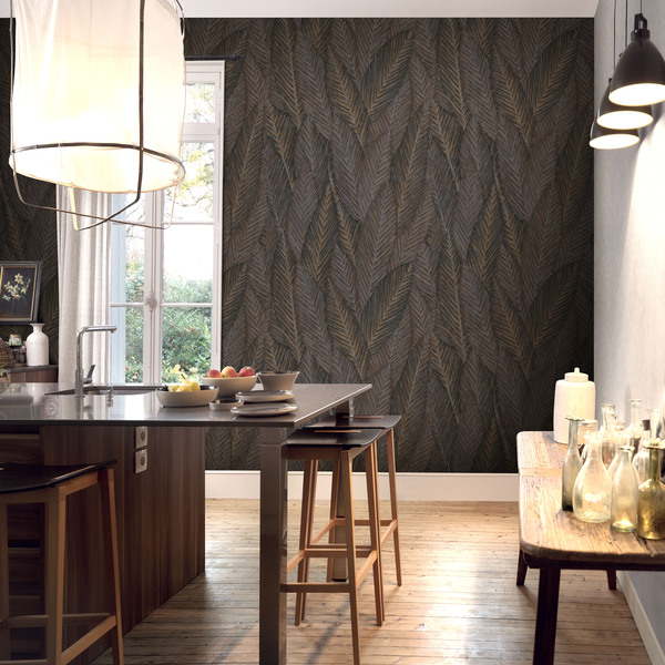 L’aspect visuel est renforcé par un travail de texture en relief remarquable. Chaque nervure est soulignée par des lignes irisées qui captent la lumière, donnant au papier un éclat métallique discret selon l’exposition. Ce jeu de contrastes entre les zones sombres et les reflets cuivrés apporte une dimension 3D tactile et une chaleur immédiate à la pièce. C’est le choix idéal pour un décor « Jungle Chic » ou un intérieur au style Art Déco modernisé.