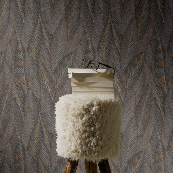Ce papier peint se distingue par un motif de feuillage stylisé qui s’entrelace avec une élégance graphique. Inspiré par la structure des plumes ou des feuilles de palmier, il propose une répétition verticale qui donne de la hauteur et du rythme à vos murs. Sa palette chromatique profonde, mêlant des nuances de brun chocolat, de cuivre et de gris anthracite, crée une atmosphère feutrée et sophistiquée.