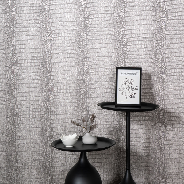 Affirmez le caractère de votre décoration avec ce papier peint d’exception imitant à la perfection la peau de crocodile. Ce revêtement audacieux joue sur un réalisme saisissant grâce à un embossage précis qui reproduit les écailles et le grain naturel du cuir. Sa teinte gris anthracite aux reflets argentés apporte une touche minérale et contemporaine, idéale pour créer une atmosphère « boutique hôtel » ou un salon ultra-chic.