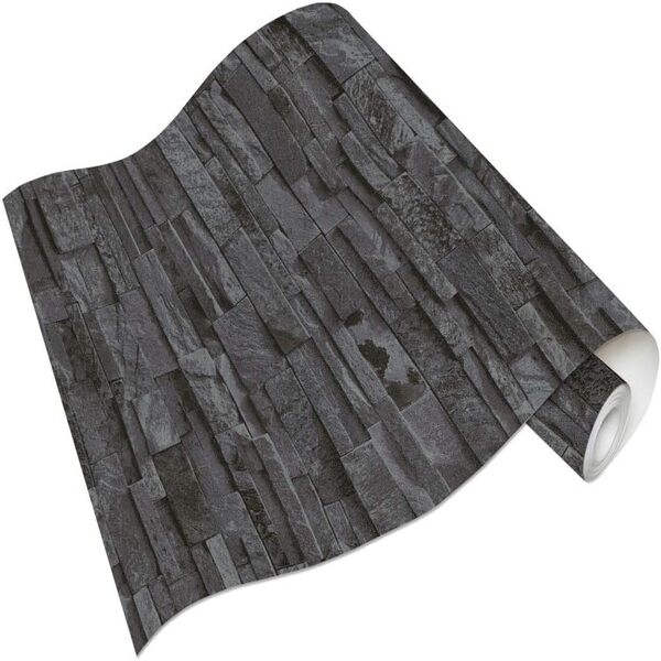 Ce papier peint propose une variante plus sombre et intense de l’imitation pierre de parement, évoquant l’aspect brut de l’ardoise ou du schiste anthracite. Le design est structuré par des lamelles de pierres horizontales aux longueurs inégales, créant un rythme visuel serré qui renforce l’aspect authentique et minéral. Contrairement à des modèles plus clairs, cette version mise sur des nuances de gris charbon et de noir graphite, offrant un rendu particulièrement profond et élégant.