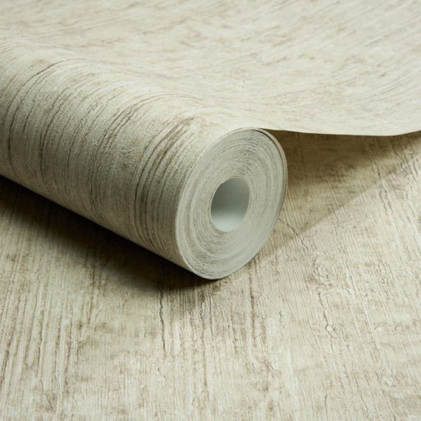 Ce papier peint imitation bois déclinée ici dans une tonalité beige crème et sable beaucoup plus lumineuse et chaleureuse. Le motif conserve cette structure verticale organique qui simule l’aspect de planches brossées ou de fibres végétales compressées, avec des stries irrégulières qui apportent un relief tactile et visuel saisissant. On y retrouve des nuances de blanc cassé et de brun très clair qui imitent les veines naturelles du bois tout en créant un effet de matière proche du lin brut ou du papier artisanal.