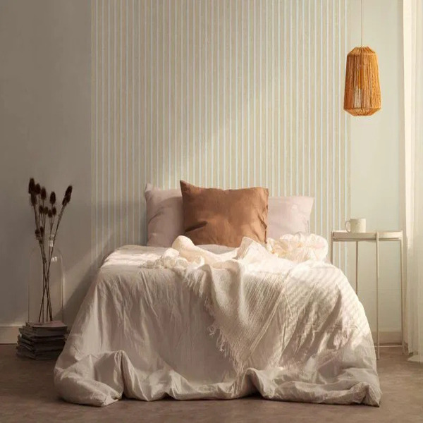 L’aspect général dégage une atmosphère de confort scandinave (hygge) et de modernité organique. Ce revêtement est idéal pour apporter de la texture et de la chaleur à un intérieur sans l’encombrer visuellement. Sa structure linéaire très marquée est un excellent atout pour allonger les murs et donner une impression de hauteur sous plafond tout en instaurant une ambiance feutrée. C’est un choix parfait pour un mur de salon derrière une télévision, une entrée ou une tête de lit, offrant un rendu à la fois architectural et accueillant. Il s’harmonise idéalement avec une décoration minimaliste, des plantes vertes et des matériaux bruts pour un style résolument contemporain.