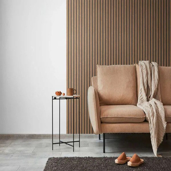L’aspect général dégage une atmosphère de confort scandinave (hygge) et de modernité organique. Ce revêtement est idéal pour apporter de la texture et de la chaleur à un intérieur sans l’encombrer visuellement. Sa structure linéaire très marquée est un excellent atout pour allonger les murs et donner une impression de hauteur sous plafond tout en instaurant une ambiance feutrée. C’est un choix parfait pour un mur de salon derrière une télévision, une entrée ou une tête de lit, offrant un rendu à la fois architectural et accueillant. Il s’harmonise idéalement avec une décoration minimaliste, des plantes vertes et des matériaux bruts pour un style résolument contemporain.