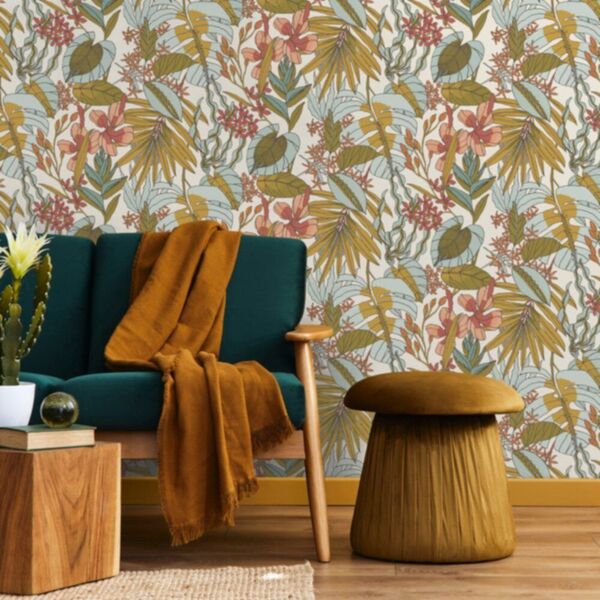 Ce papier peint propose une interprétation artistique et colorée du thème végétal, avec un style « Arty » très affirmé. Le motif se déploie sur un fond blanc pur, mettant en scène une végétation luxuriante composée de grandes feuilles de palmier, de feuilles de monstera et de grappes de fleurs délicates. Contrairement à une illustration naturaliste, le design utilise des traits noirs épais pour souligner les formes, ce qui lui donne un aspect proche d’une peinture moderne.