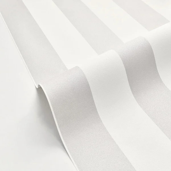Ce papier peint propose un motif à rayures verticales régulières, privilégiant une esthétique minimaliste et vaporeuse. Le décor repose sur une alternance de bandes de largeur égale, déclinées dans un gris perle très clair et un blanc lumineux. Cette combinaison de tons neutres et proches l’un de l’autre crée un contraste extrêmement subtil, presque évanescent, qui évite toute lourdeur visuelle et permet de conserver une sensation d’espace et de clarté dans la pièce.